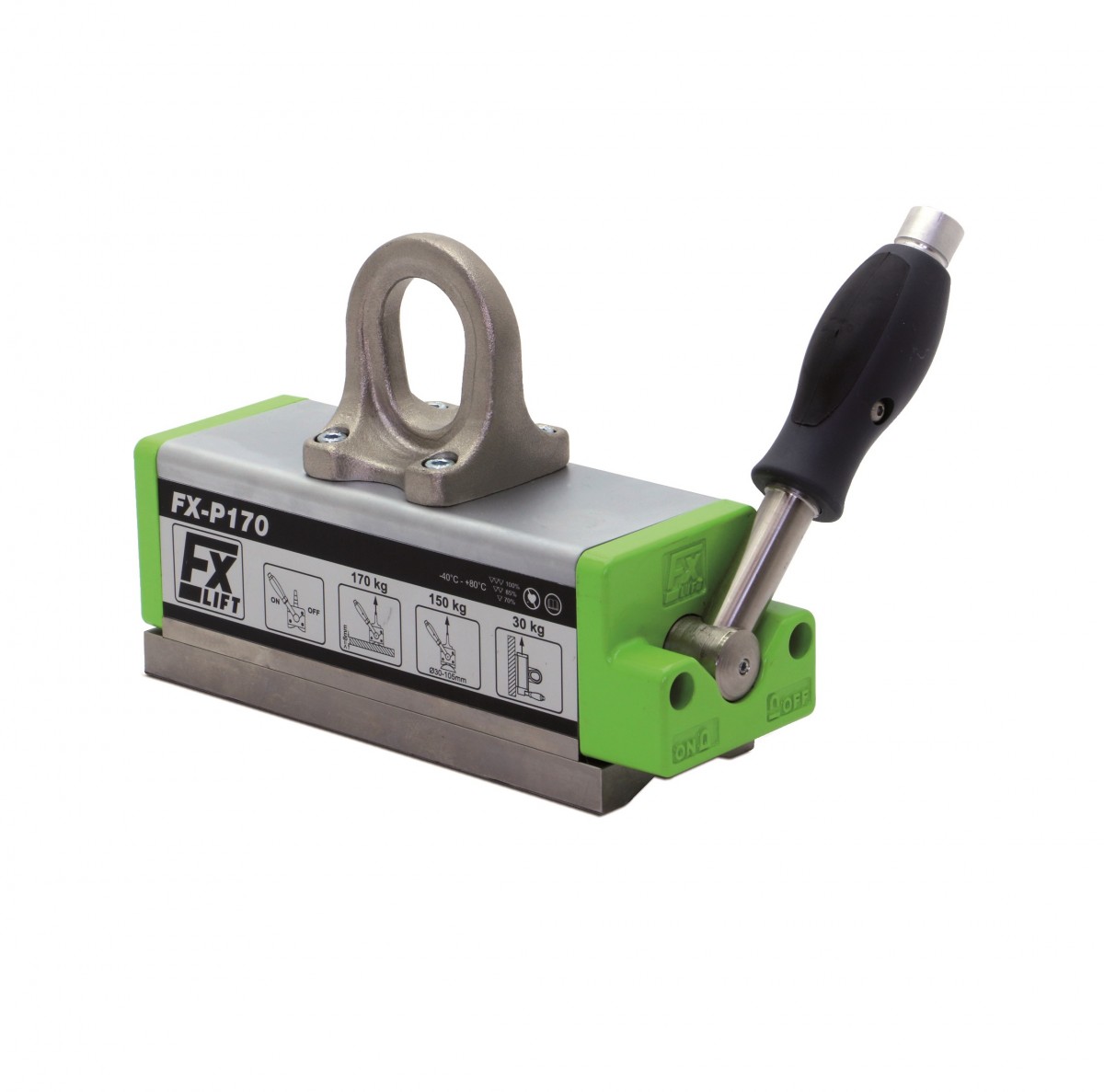 L’aimant de levage FX-P se distingue par sa conception ergonomique et ses caractéristiques de sécurité avancées. Le levier ne nécessite qu’une rotation de 90°, permettant un verrouillage facile même dans des zones d’accès restreint comme les IPN. De plus, le levier est équipé d’une sécurité de verrouillage en bout, nécessitant une pression sur un bouton pour le déverrouiller, ce qui prévient les déblocages accidentels. Avec une température maximale d’utilisation de 80°C, cet aimant est polyvalent et adapté à diverses conditions de travail.